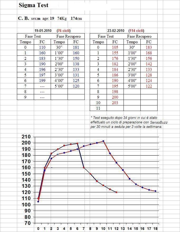 Per rendere ancora più completo il report individuale è possibile, con l'ausilio di un cardiofrequenzimetro, fare l'analisi della frequenza cardiaca durante il test e fare raffronti con eventuali test eseguiti precedentemente. La figura sottostante ne è un esempio.